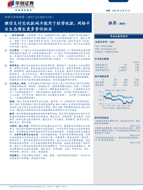 【华创证券】【20211127】20211127-华创证券-传媒行业周观察:微信支付宝收款码不能用于经营收款,网络平台生态催生更多责任担当-25页 行业研究