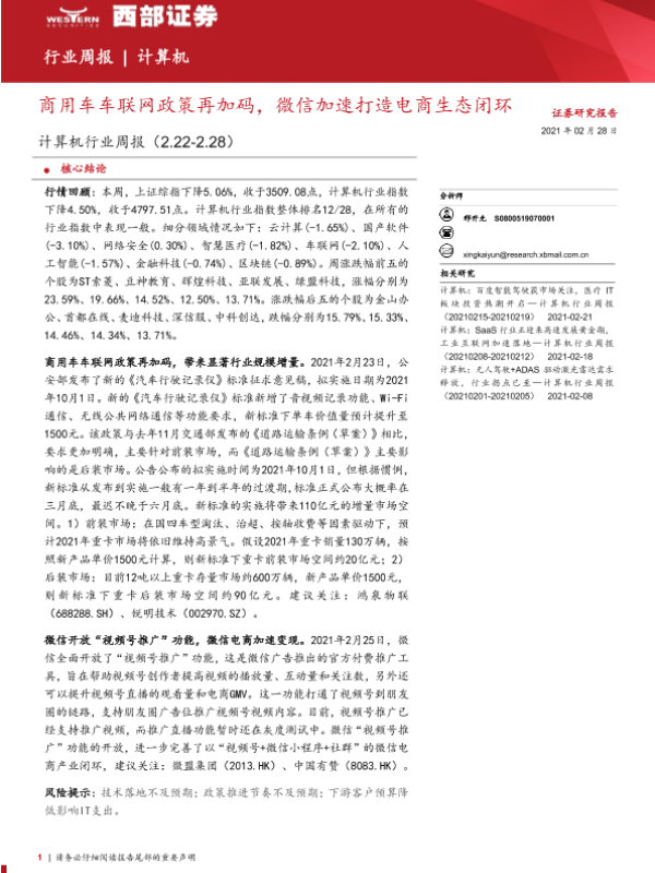 【西部证券】【20210228】计算机行业周报:商用车车联网政策再加码,微信加速打造电商生态闭环-16页 行业研究