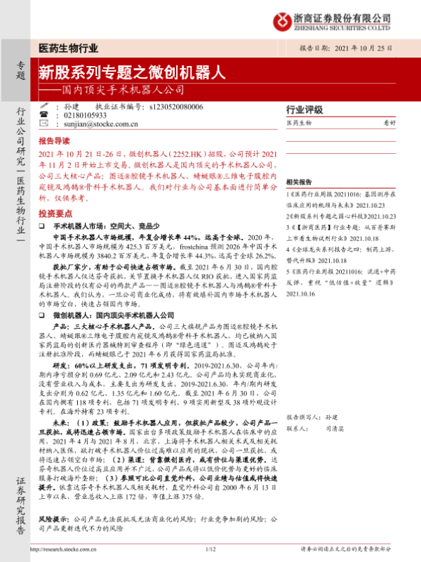 【浙商证券】【20211025】新股系列专题之微创机器人-12页 行业研究