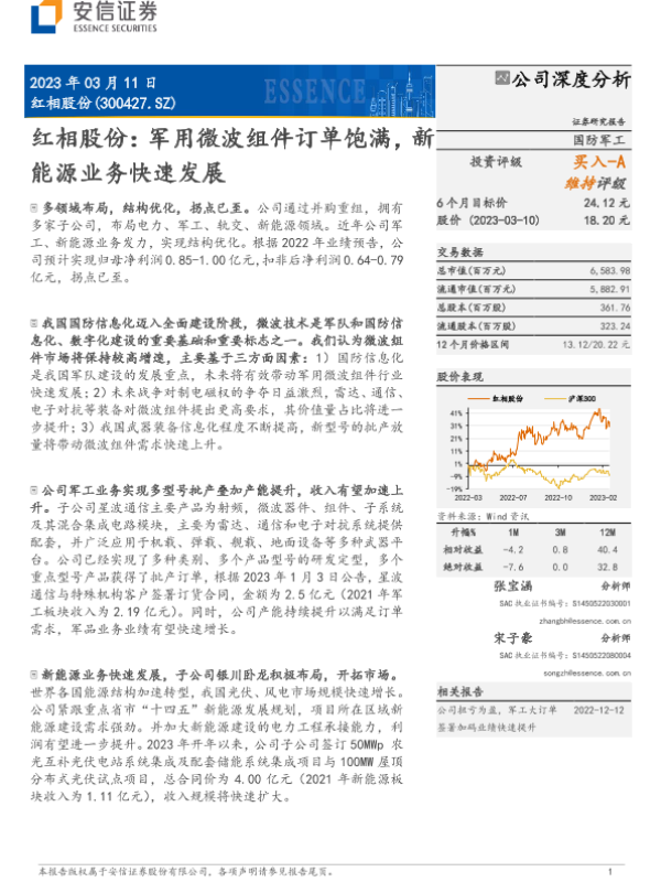 【安信证券】【20230311】红相股份(300427):军用微波组件订单饱满,新能源业务快速发展-22页 行业研究