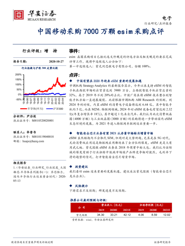 【华安证券】【20201027】电子行业:中国移动采购7000万颗eSIM采购点评-2页 行业研究