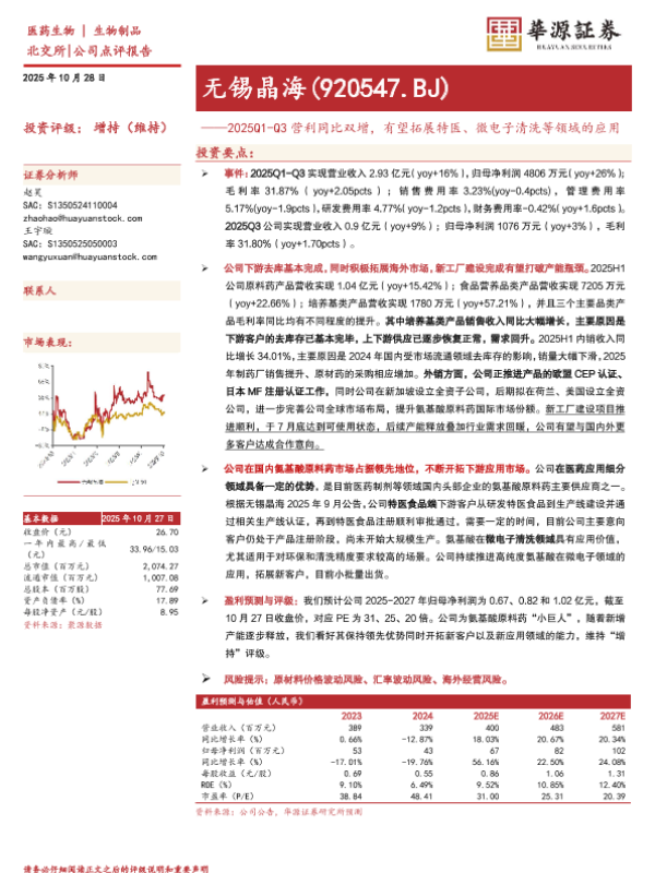 【华源证券】【202510】2025Q1-Q3营利同比双增,有望拓展特医、微电子清洗等领域的应用-3页 证券期货研究报告