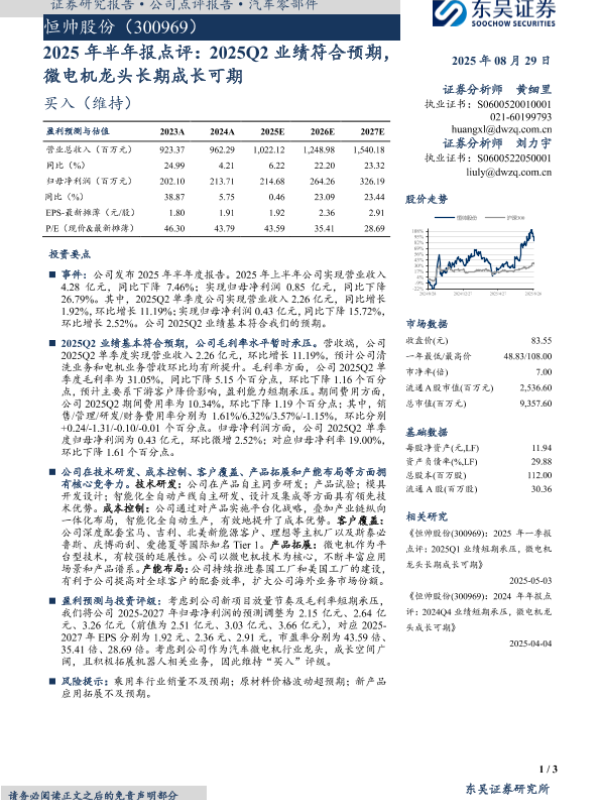 【东吴证券】【20250829】恒帅股份-2025年半年报点评:2025Q2业绩符合预期,微电机龙头长期成长可期-3页 证券期货研究报告