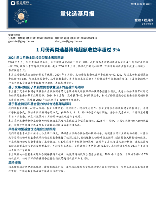 【国金证券】【20240220】量化选基月报:1月份两类选基策略超额收益率超过3%-11页 行业研究