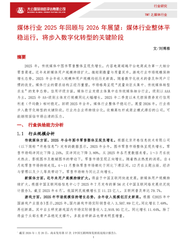 【大公国际】【2025】媒体行业2025年回顾与2026年展望:媒体行业整体平稳运行,将步入数字化转型的关键阶段-8页 行业研究