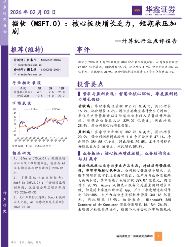 【华鑫证券】【202602】微软(MSFT.O):核心板块增长乏力,短期承压加剧-5页 证券期货研究报告