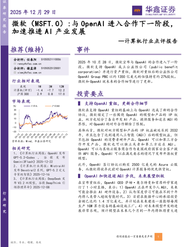 【华鑫证券】【202512】微软:与OpenAI进入合作下一阶段,加速推进AI产业发展-4页 证券期货研究报告
