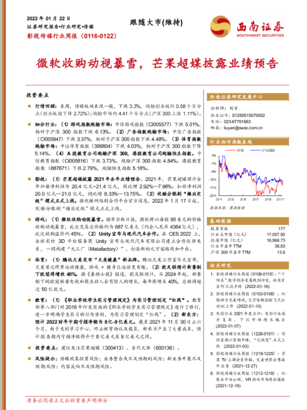 【西南证券】【20220122】20220122-西南证券-影视传媒行业周报:微软收购动视暴雪,芒果超媒披露业绩预告-17页 行业研究