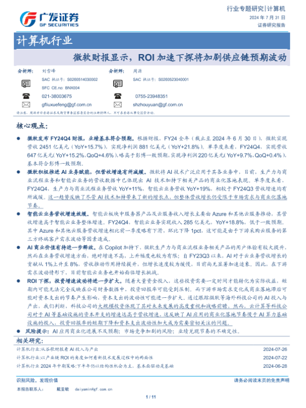【广发证券】【20240731】微软财报显示,ROI加速下探将加剧供应链预期波动-11页 行业研究