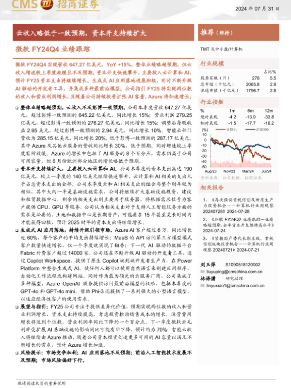 【海通证券】【20240731】计算机行业微软FY24Q4业绩跟踪:云收入略低于一致预期,资本开支持续扩大-16页 行业研究