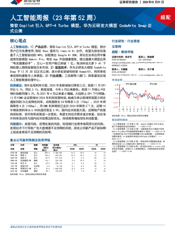 【国信证券】【20240101】国信证券-人工智能周报(23年第52周):微软Copilot引入GPT-4 Turbo模型,华为云研发大模型CodeArts Snap正式公测-13页 行业研究