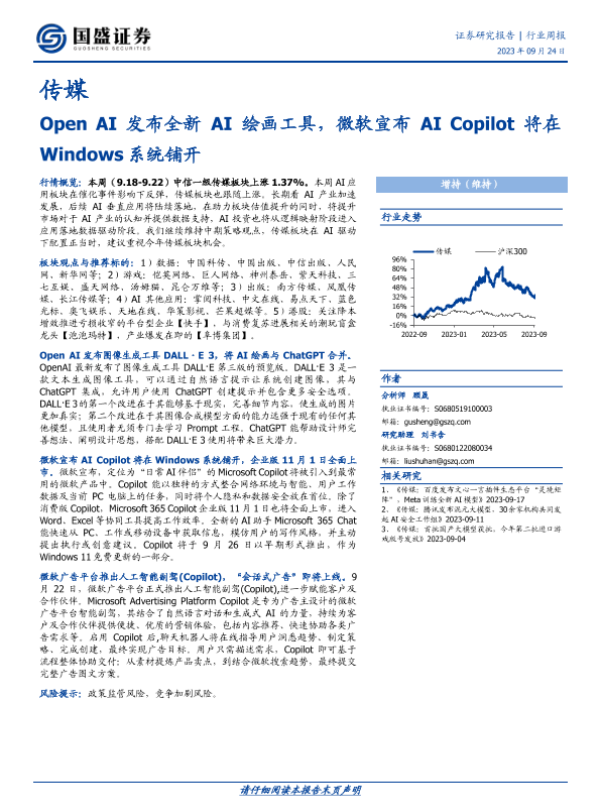 【国盛证券】【20230924】传媒行业周报:Open AI发布全新AI绘画工具,微软宣布AI Copilot将在Windows系统铺开-10页 行业研究