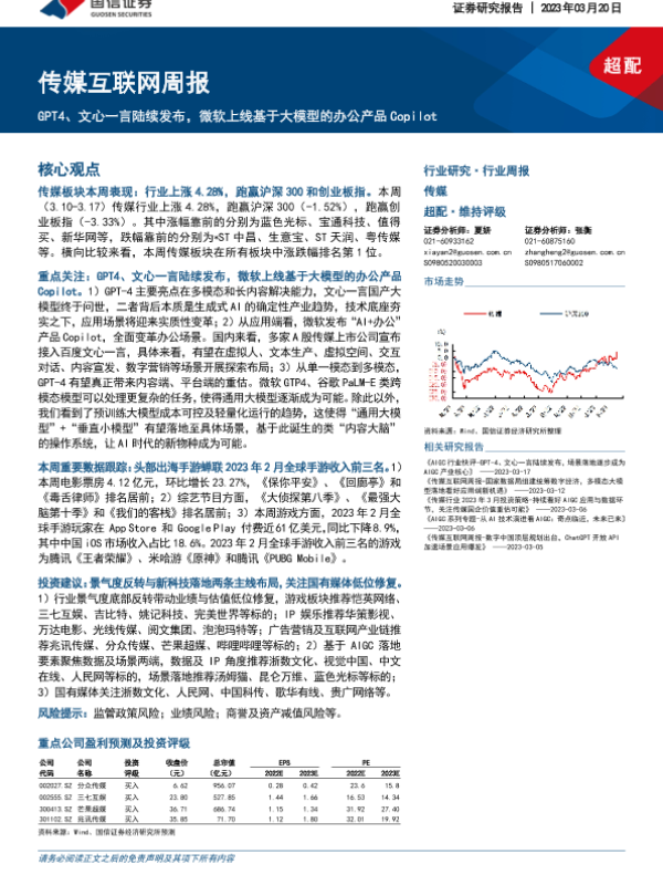 【国信证券】【20230320】GPT4、文心一言陆续发布,微软上线基于大模型的办公产品Copilot-26页 行业研究