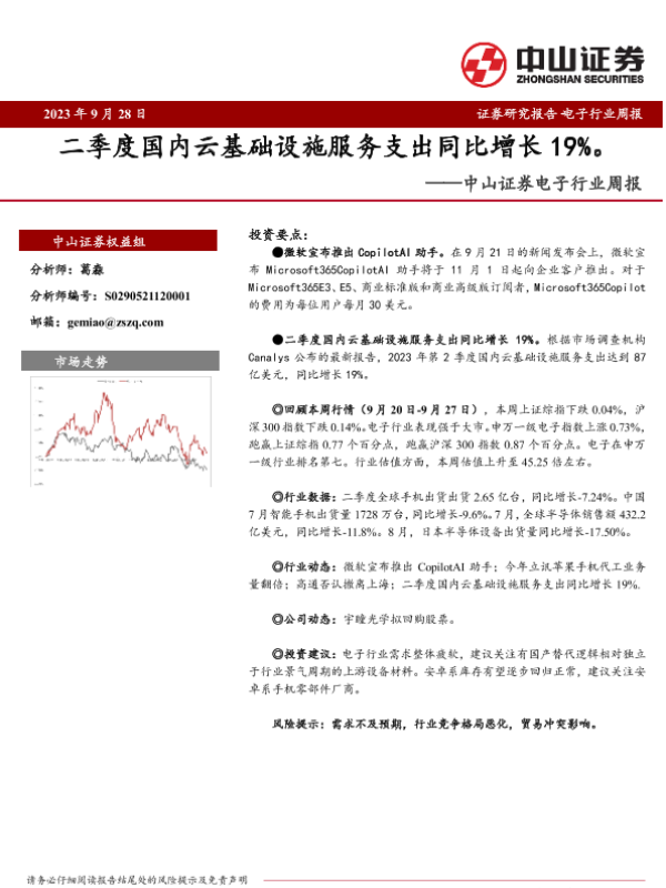 【中山证券】【20230928】20230928-中山证券-电子行业周报:二季度国内云基础设施服务支出同比增长19%-10页 行业研究