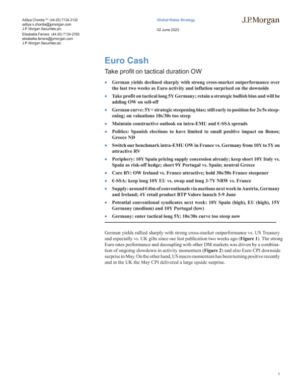 【J.P. Morgan】【20230602】JPMorgan Econ FI-Euro Cash Take profit on tactical duration OW--19页 行业研究