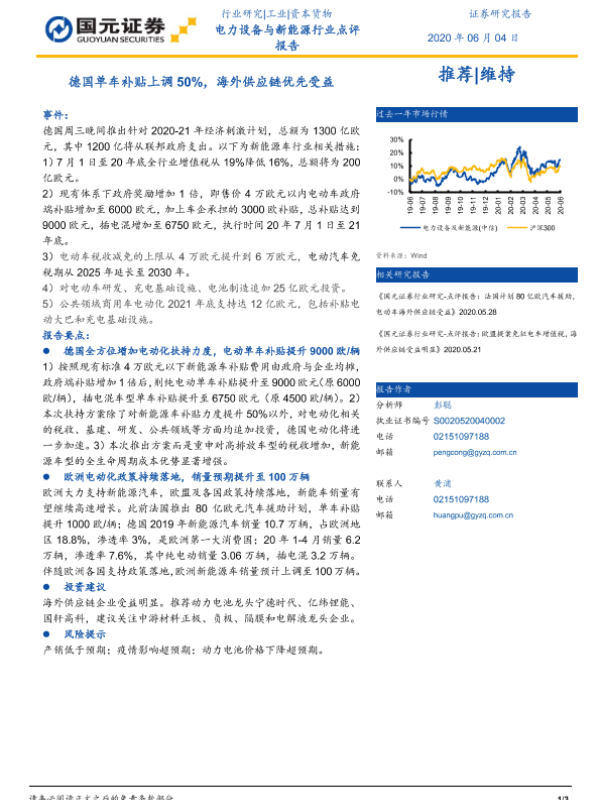 【国元证券】【20200604】电力设备与新能源行业点评报告:德国单车补贴上调50%,海外供应链优先受益-3页 行业研究