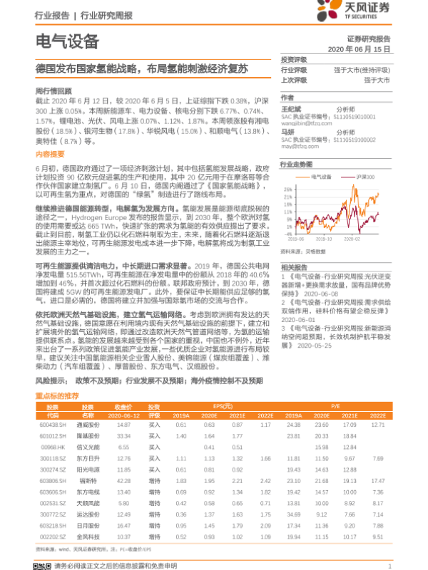 【天风证券】【20200615】电气设备行业研究周报:德国发布国家氢能战略,布局氢能刺激经济复苏-17页 行业研究