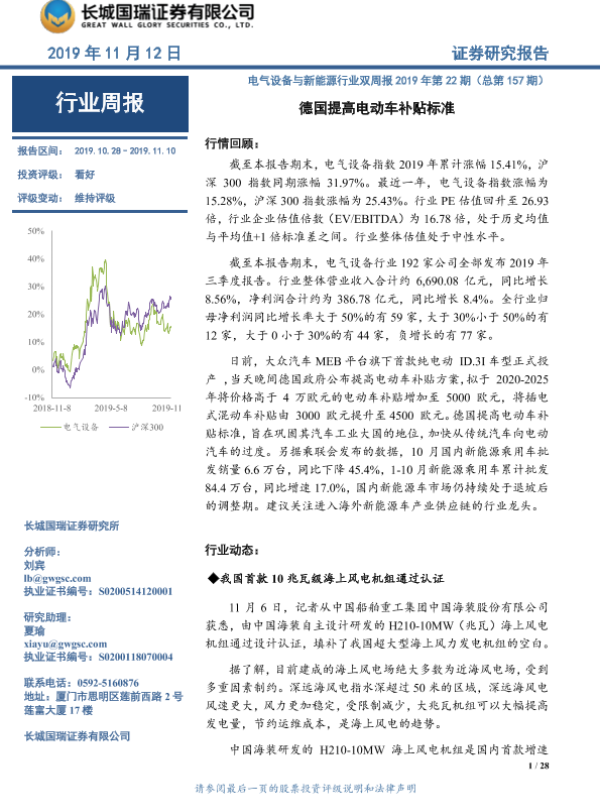 【长城国瑞证券】【20191112】电气设备与新能源行业双周报2019年第22期(总第157期):德国提高电动车补贴标准-28页 行业研究