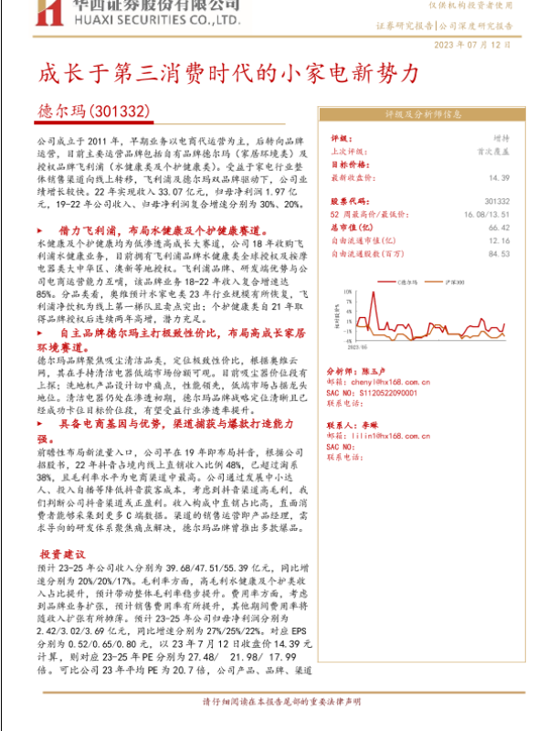【华西证券】【20230712】德尔玛(301332)成长于第三消费时代的小家电新势力-28页 行业研究