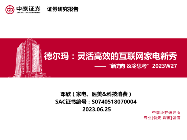 【中泰证券】【20230625】家电:“新方向&冷思考”2023W27-德尔玛:灵活高效的互联网家电新秀-23页 行业研究