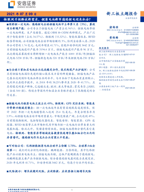 【安信证券】【20210709】新三板主题报告:物联网升级释放新需求,锂原电池新军德瑞锂电迎来机会?-29页 行业研究
