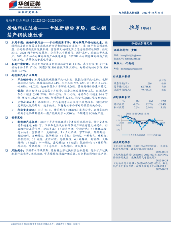 【华创证券】【20221031】电动车行业周报:德福科技过会_卡位新能源市场,锂电铜箔产销快速放量-27页 行业研究