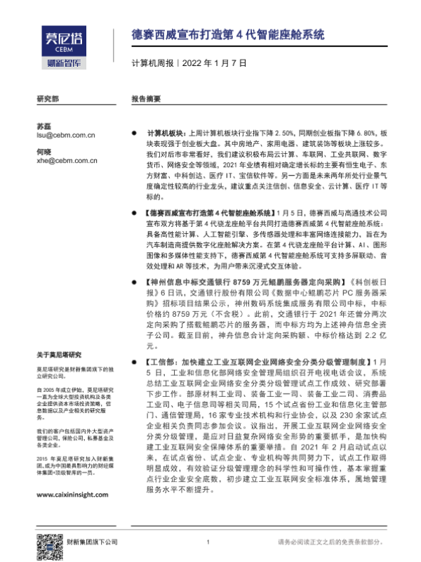 【莫尼塔研究】【20220107】20220107-莫尼塔投资-计算机周报:德赛西威宣布打造第4代智能座舱系统-7页 行业研究