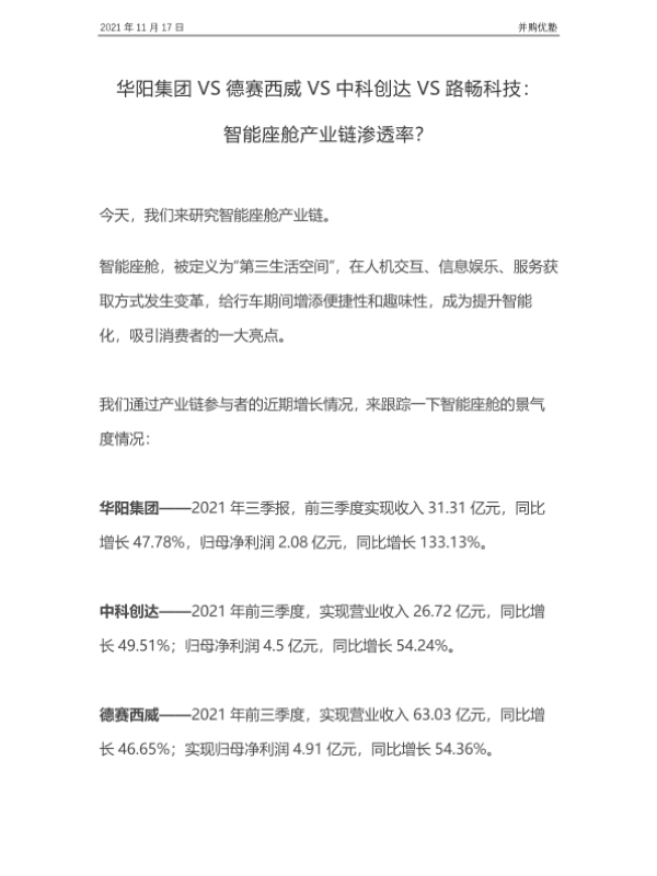 【优塾】【20211117】华阳集团VS德赛西威VS中科创达VS路畅科技:智能座舱产业链渗透率?-30页 行业研究