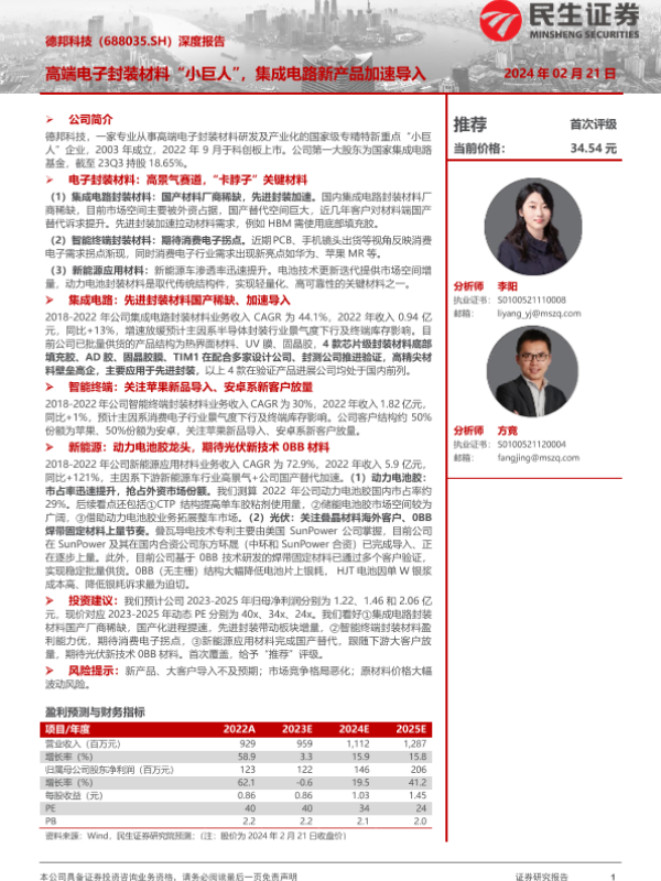 【民生证券】【20240221】20240221-民生证券-德邦科技-688035.SH-深度报告:高端电子封装材料“小巨人”,集成电路新产品加速导入-33页 行业研究