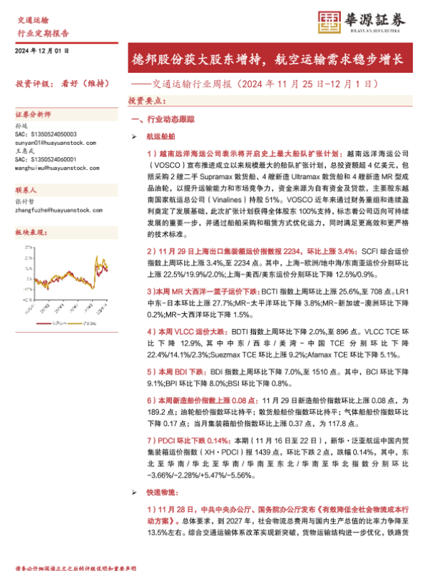 【华源证券】【20241201】交通运输行业周报:德邦股份获大股东增持,航空运输需求稳步增长-14页 行业研究