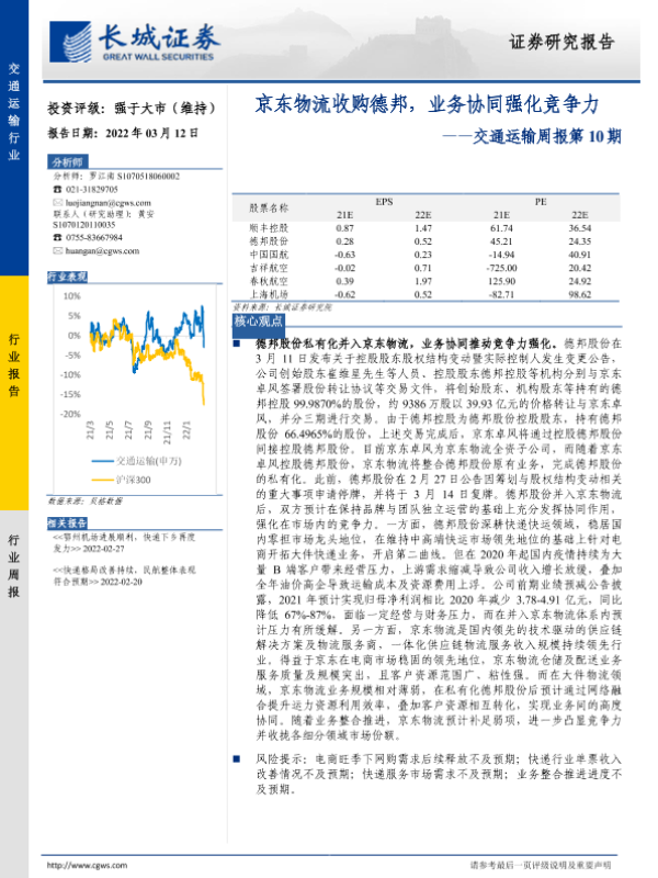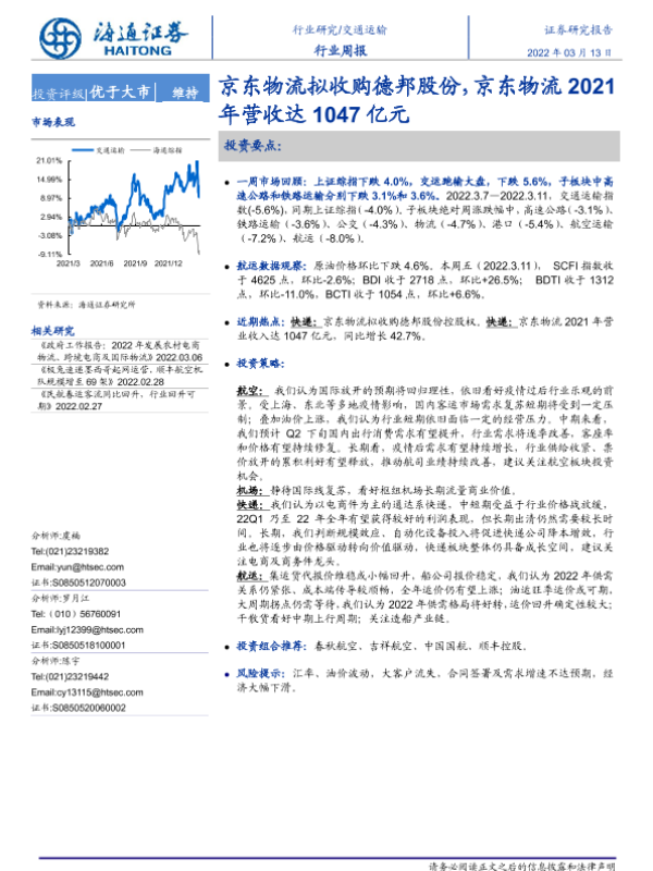 【海通证券】【20220313】交通运输行业周报:京东物流拟收购德邦股份,京东物流2021年营收达1047亿元-9页 行业研究