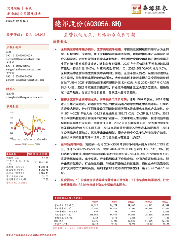 【华源证券】【20250214】德邦股份——直营快运龙头,网络融合成长可期-25页 行业研究