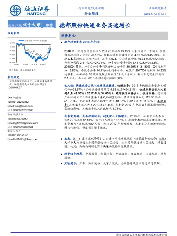 【海通证券】【20190414】交通运输行业周报:德邦股份快递业务高速增长-10页 行业研究