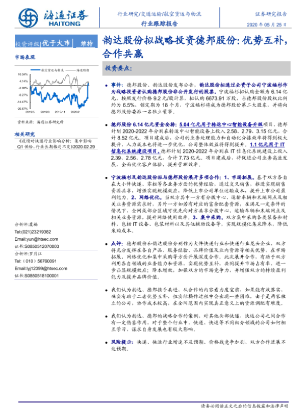 【海通证券】【20200525】韵达股份拟战略投资德邦股份:优势互补合作共赢-3页 行业研究