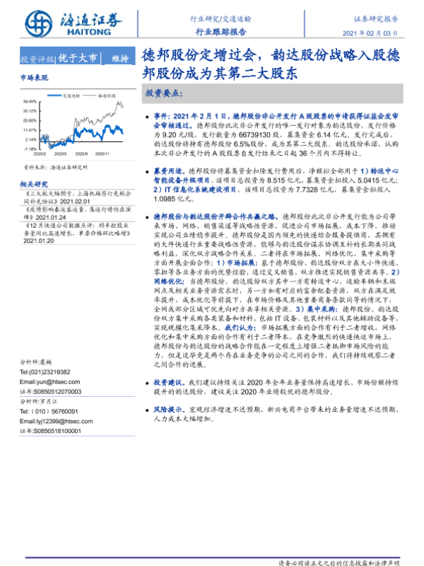 【海通证券】【20210203】德邦股份定增过会,韵达股份战略入股德邦股份成为其第二大股东-4页 行业研究