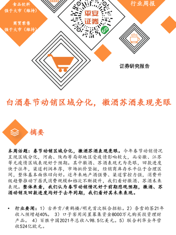 【平安证券】【20220211】大消费行业周报:白酒春节动销区域分化,徽酒苏酒表现亮眼-6页 行业研究