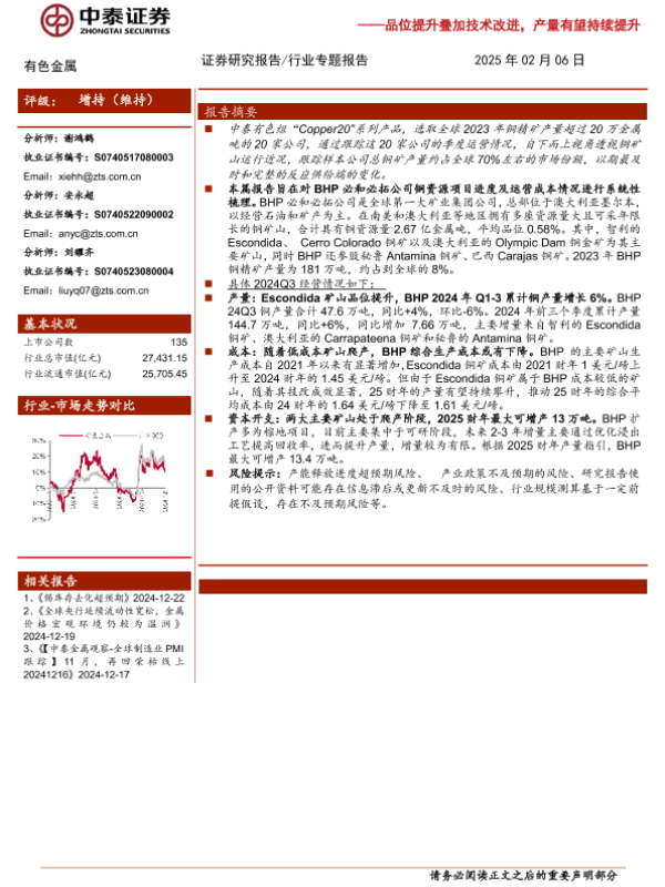 【中泰证券】【20250206】有色金属行业全球铜资源“Copper20”跟踪系列:BHP必和必拓公司,品位提升叠加技术改进,产量有望持续提升-10页 行业研究