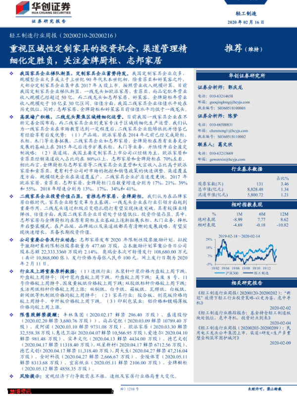 【华创证券】【20200216】轻工制造行业周报:重视区域性定制家具的投资机会,渠道管理精细化定胜负,关注金牌厨柜、志邦家居-14页 行业研究