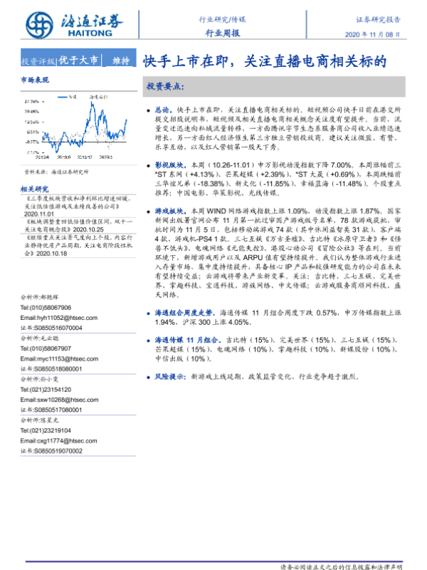 【海通证券】【20201108】20201108-海通证券-传媒行业周报:快手上市在即,关注直播电商相关标的-10页 行业研究
