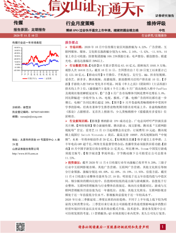 【山西证券】【20201110】20201110-山西证券-传媒行业月度策略:博纳IPO过会快手递交上市申请,继续把握业绩主线-24页 行业研究