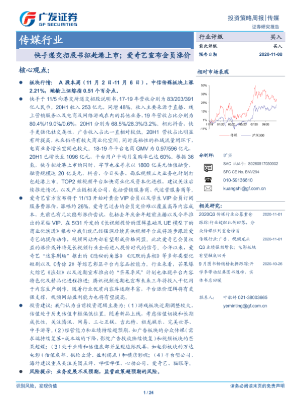 【广发证券】【20201108】20201108-广发证券-传媒行业:快手递交招股书拟赴港上市;爱奇艺宣布会员涨价-24页 行业研究
