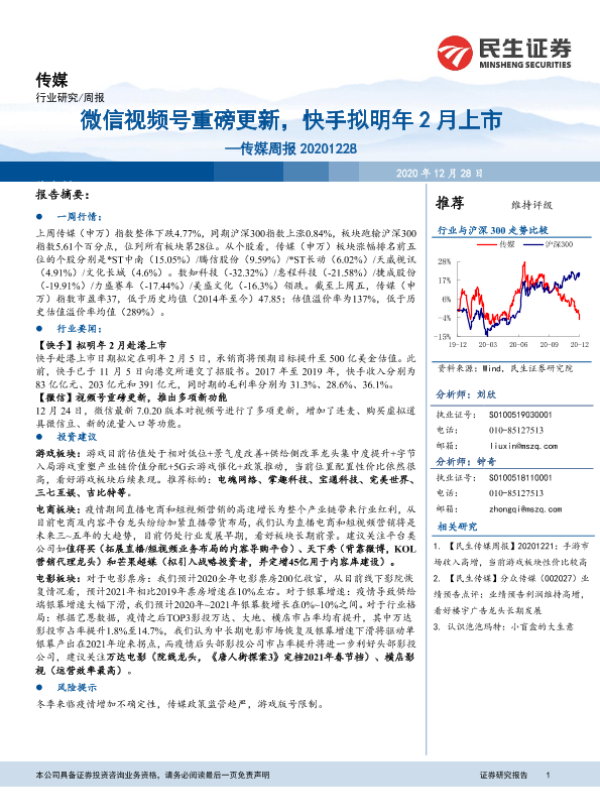 【民生证券】【20201228】20201228-民生证券-传媒周报:微信视频号重磅更新,快手拟明年2月上市-17页 行业研究