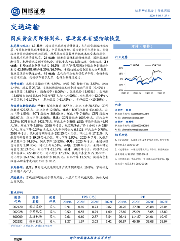 【国盛证券】【20200927】交通运输行业周报:国庆黄金周即将到来,客运需求有望持续恢复-21页 行业研究