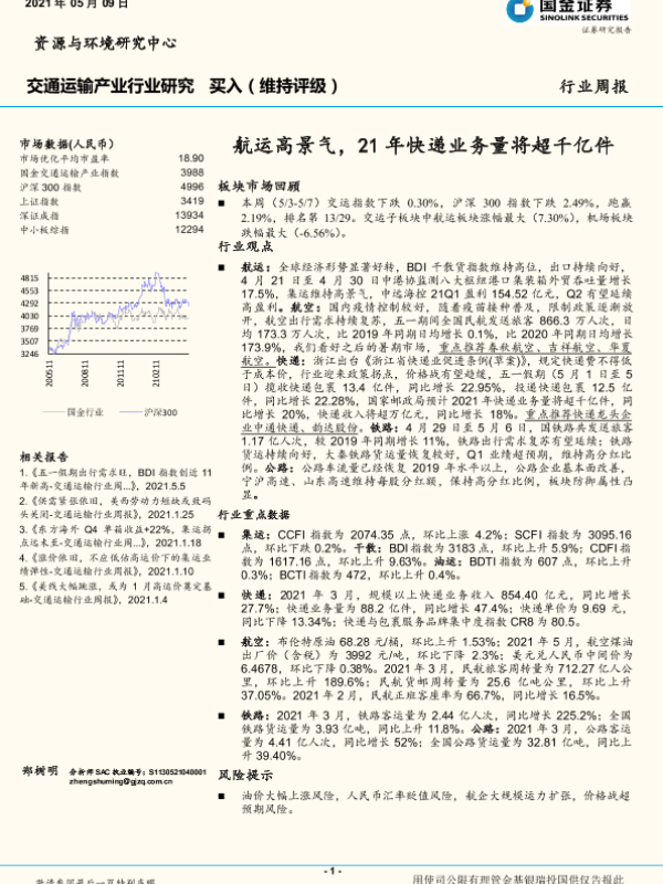 【国金证券】【20210509】交通运输产业行业研究:航运高景气,21年快递业务量将超千亿件-14页 行业研究