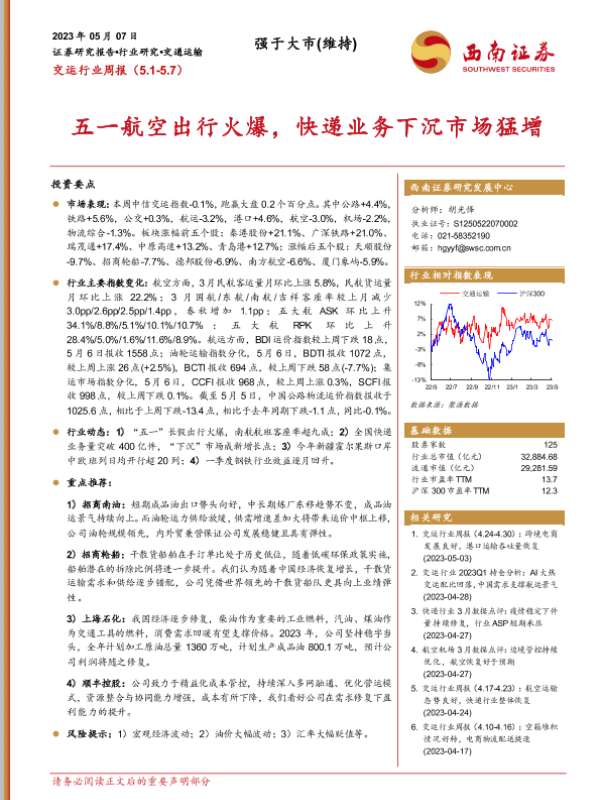 【西南证券】【20230507】交运行业周报:五一航空出行火爆,快递业务下沉市场猛增-20页 行业研究