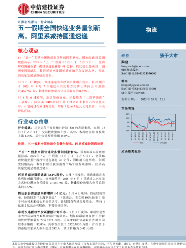 【中信建投证券】【20250512】物流行业:五一假期全国快递业务量创新高,阿里系减持圆通速递-19页 证券期货研究报告