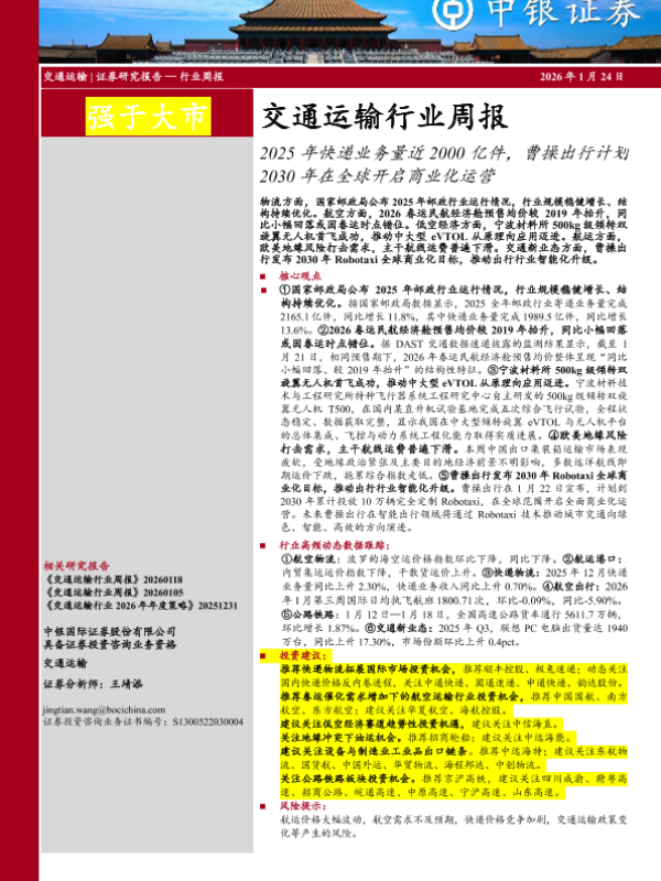 【中银证券】【202601】交通运输行业周报:2025年快递业务量近2000亿件,曹操出行计划2030年在全球开启商业化运营-26页 证券期货研究报告