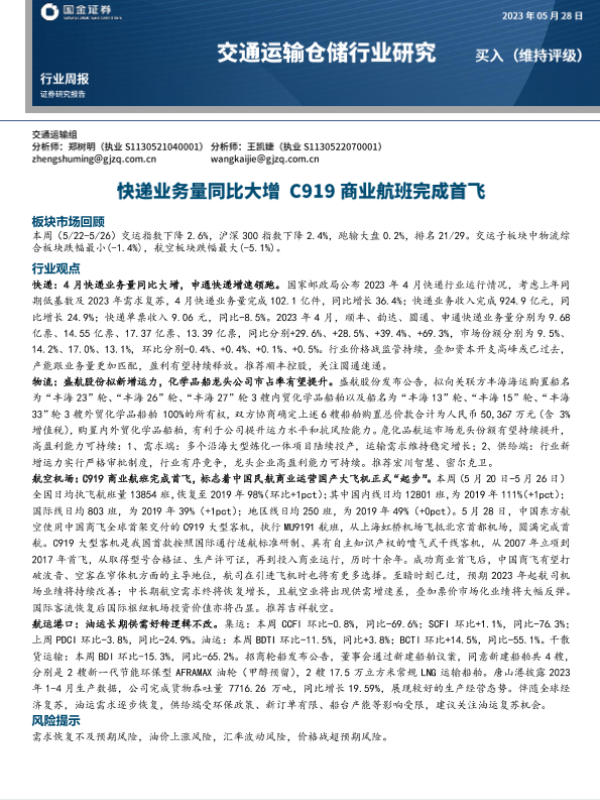 【国金证券】【20230528】交通运输仓储行业研究:快递业务量同比大增 C919商业航班完成首飞-14页 行业研究
