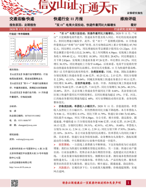 【山西证券】【20201223】快递行业11月报:“双11”电商大促拉动,快递件量同比大幅增长-13页 行业研究