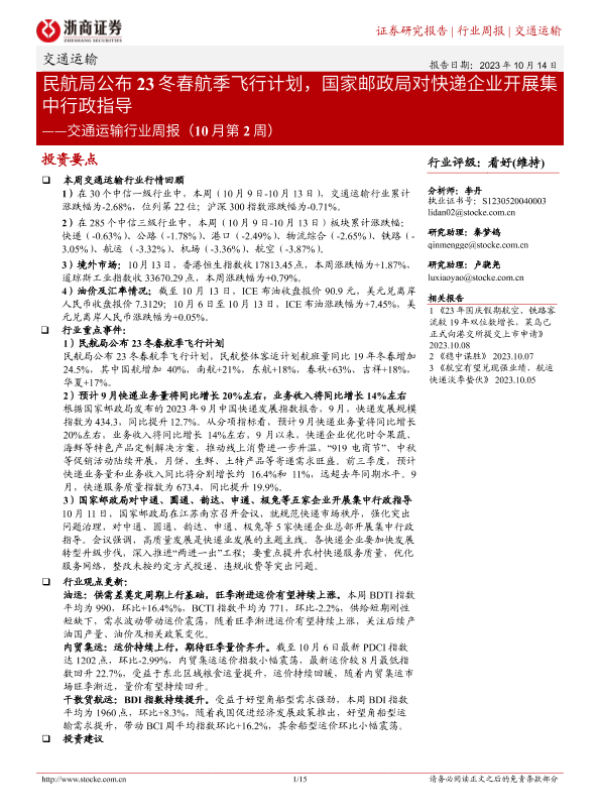 【浙商证券】【20231014】交通运输行业周报:民航局公布23冬春航季飞行计划,国家邮政局对快递企业开展集中行政指导-15页 行业研究